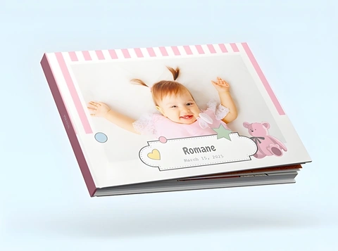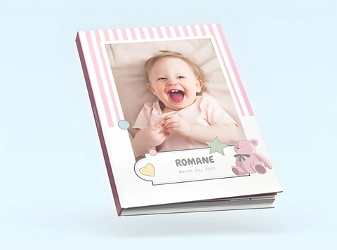 Each baby photo book is entirely customizable: choose the format (portrait, landscape, square), the cover (soft or hard), the type of paper, and finishes such as varnish or logo removal for an even more refined result.
